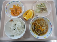 ちくわの磯辺揚げ にんじんのきんぴら 煮込みうどん わかめごはん オレンジ |