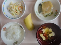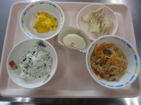 ちくわの磯辺揚げ かぼちゃと卵のサラダ 煮込みうどん わかめごはん 梨 |