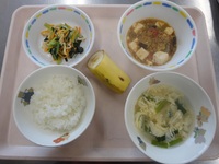 野菜たっぷり夏マ-ボ 小松菜とじゃこの和え物 にら玉ス-プ ごはん バナナ |