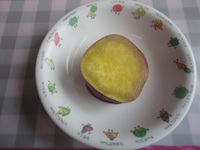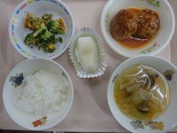 | ふかし芋 | ハンバ-グソ-ス煮 ブロッコリ-とコ-ンのおかか和え コンソメス-プ ごはん 梨 |