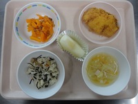 白身フライ にんじんの和風サラダ 野菜とウィンナ-のス-プ ひじきごはん 梨 |