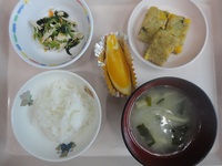 鯖とかぼちゃのオーブン焼き ほうれん草とささみの酢和え みそ汁(千切り大根) ごはん オレンジ |