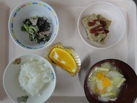 おさかなバ-グ 小松菜のひじきのごまマヨ和え みそ汁(キャベツ・あげ) ごはん オレンジ |