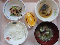 鯖の梅干し煮 炒り豆腐(ツナひじき) 冷やしみそ汁 ごはん オレンジ |
