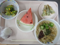 | ホットケ-キ | ちくわの磯辺揚げ ブロッコリ-とコ-ンのおかか和え 流しそうめう ゆかりおにぎり すいか |