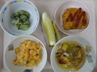 白身フライ わかめの酢の物 冬瓜のベ-コンス-プ チキンライス グレ-プフル-ツ |