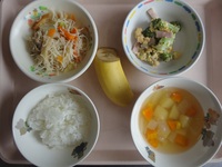 焼きビ-フン ブロッコリ-と卵のサラダ 野菜のコロコロス-プ ごはん バナナ |