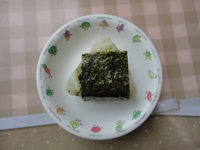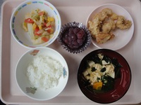 | おかかおにぎり | 鶏肉のからあげ キャベツとベ-コンの中華和え かき玉汁 ごはん ぶどう |