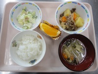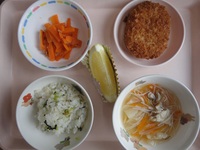 コロッケ グレ-プフル-ツ にんじんの和風サラダ ビ-フンス-プ 青菜チャ-ハン |
