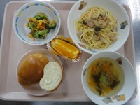 チキンときのこのクリ-ムパスタ ブロッコリ-とコ-ンのおかか和え わかめス-プ ロ-ルパン オレンジ |
