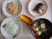 焼き鯖 卵の花 すまし汁 ごはん オレンジ |