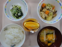 | フル-ツヨ-グルト | すき焼き風煮 キャベツと小松菜のサラダ みそ汁(かぼちゃ・ねぎ) ごはん オレンジ |