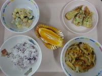 ちくわの磯辺揚げ 大豆とこんにゃくのサラダ 煮込みうどん ゆかりごはん オレンジ |