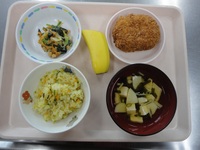| ジャムロ-ル | コロッケ ほうれん草の納豆和え 若竹汁 ピラフ(鯖・カレ-) バナナ |