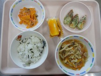ちくわの磯辺揚げ にんじんの金平 煮込みうどん わかめごはん オレンジ |
