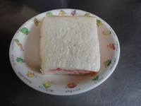 | ぱりんこ | ハンバーグソース煮 青菜とコーンのごま和え キャベツのベーコンスープ 赤飯 ゼリー いちご |