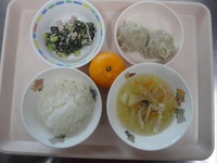シューマイ 小松菜とひじきのごまマヨ和え キャベツのベーコンスープ ごはん みかん |
