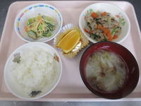 野菜たっぷり豚肉の生姜焼き スパゲッティサラダ なめこのみそ汁 ごはん オレンジ |