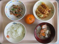 ぎょうざのあんかけ ひじきのツナサラダ 石狩汁 ごはん みかん |