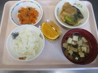 さばのみそ煮 にんじんのきんぴら 若竹汁 ごはん はっさく |