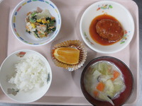 ハンバ-グソ-ス煮 小松菜サラダ 豆乳みそ汁 ごはん はっさく |