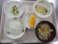 白身魚のクリームコーン焼き きゅうりとキャベツの昆布和え 夏豚汁 ごはん オレンジ |