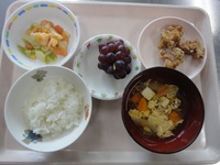 鶏肉の唐揚げ キャベツとコーンの中華和え かき玉汁 ごはん ぶどう |