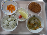 コロッケ チーズ ニンジンの和風サラダ 肉団子スープ 青菜チャーハン グレープフルーツ |