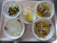 鶏のつくねあんかけ 青菜とコーンのごま和え 玉ねぎとベーコンのスープ ごはん バナナ |