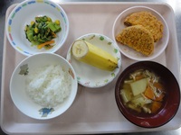 ミンチカツ 春の彩和え たぬき汁 ごはん バナナ |
