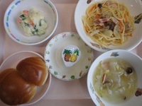 | オレンジゼリー | チキンときのこのクリームパスタ マセドアンサラダ 白菜のベーコンスープ ロールパン ゼリー |