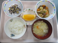 牛肉とじゃが芋の煮物 切干大根とひじきのサラダ みそ汁(キャベツ・揚げ) ごはん オレンジ |