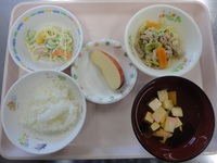 豚肉とキャベツのみそ炒め スパゲティサラダ 豆腐すまし汁(わかめ) ごはん りんご |