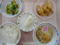 餃子のあんかけ ブロッコリーとコーンのおかかあえ ラーメン ごはん 梨 |