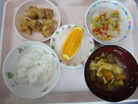 鶏肉の唐揚げ キャベツとコーンの中華和え かき玉汁 ごはん オレンジ |