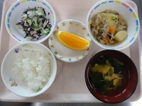 肉じゃが ひじきサラダ 冷たいすまし汁 ごはん オレンジ |