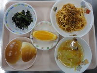 ミートスパゲティ ひじきときゅうりのサラダ コンソメスープ ロールパン オレンジ |