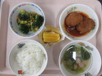 ハンバ-グソ-ス煮 ブロッコリ-とコーンのおかか和え しめじとチンゲン菜のスープ ごはん オレンジ |