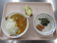 ウインナ- 小松菜とひじきのごまマヨ和え カレ-ライス りんご |