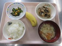 鶏の海苔焼き 春の彩り和え たぬき汁(じゃがいも) ごはん バナナ |