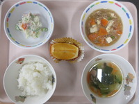 | 昆布おにぎり | マ-ボ-豆腐 ポテトサラダ しめじとチンゲン菜のス-プ ごはん はっさく |