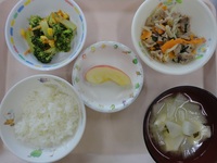 野菜たっぷり豚肉の生姜焼き ブロッコリーとコーンのおかか和え みそ汁(大根) ごはん りんご |