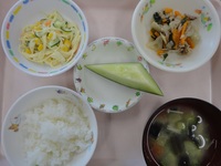 豚肉のもち米蒸し ほうれん草とささみの酢和え みそ汁(じゃが芋、玉ねぎ) ごはん バナナ |