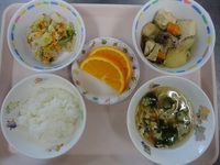 すき焼き風煮 キャベツのゆかり和え オクラスープ ごはん オレンジ |
