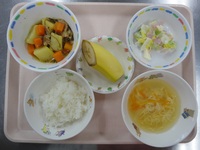| バナナヨーグルト | 野菜コロッケ にんじんの金平 豆乳スープ(白菜、ベーコン) ツナカレーピラフ いよかん |