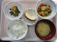 牛肉とじゃが芋の煮物 三色ナムル みそ汁(白菜) ごはん りんご |