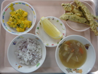 ししゃもの天ぷら かぼちゃと卵のサラダ けんちん汁 ゆかりごはん グレープフルーツ |