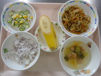 焼きそば きゅうりとちくわのサラダ しめじとチンゲン菜のスープ ゆかりごはん バナナ |
