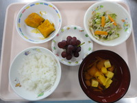 豚肉ときゃべつのみそ炒め かぼちゃ煮 卵豆腐の冷やし汁 ごはん ぶどう |