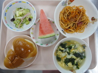 ナポリタン コールスローサラダ 洋風かき玉汁 ロールパン すいか |